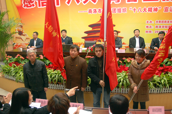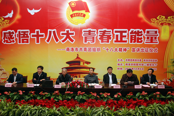 12月6日下午,由团商洛市委和院团委联合举办的十八大精神宣讲团出征仪式在我院举行,宣讲团以“感悟十八大,青春正能量”为主题,引导全市共青团员学习宣传好、贯彻落实好党的十八大精神,切实把广大青年的思想与行动统一到十八大的部署和要求上来。
