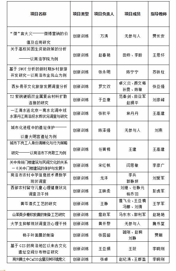 日前,省教育厅下发《关于公布2013年省级大学生创新创业训练计划项目的通知》文件,我校申报的《“微”言大义——微博营销的价值及应用研究》等18项大学生创新创业训练计划项目获准立项。其中经教育厅遴选出的5个项目已上报教育部申报国家级大学生创新创业训练计划项目。至此,我校已有20项大学生创新创业训练计划项目获省教育厅立项资助。