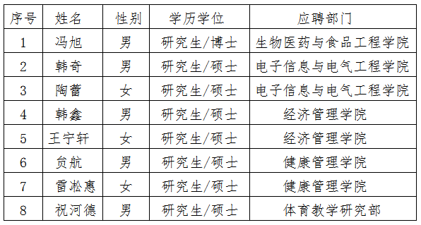 根据陕西省人社厅《关于陕西省事业单位公开招聘人员办法》规定及《88038威尼斯2020年人才招聘计划》,经过资格审查、试讲、专家面试等环节考察,并经院长办公会2019年12月12日研究,同意招聘冯旭等8位同志来我校工作,现予以公示。如有异议,请于2019年12月18日前向人事处或纪委办公室反映。