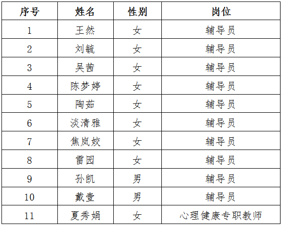 根据《88038威尼斯人才招聘工作实施办法》及《88038威尼斯2021年辅导员及心理健康专职教师招聘公告》,通过资格审查、笔试、面试等环节考察,经学校研究决定,同意录用王然等11位同志来我校工作,现予以公示。