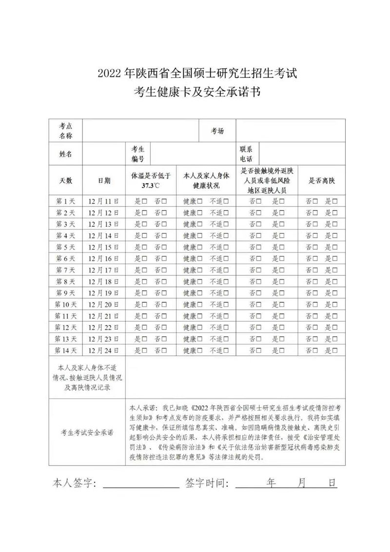 (可点击原文进入官网,查看下载附件“2022年陕西省全国硕士研究生招生考试考生健康卡及安全承诺书”)