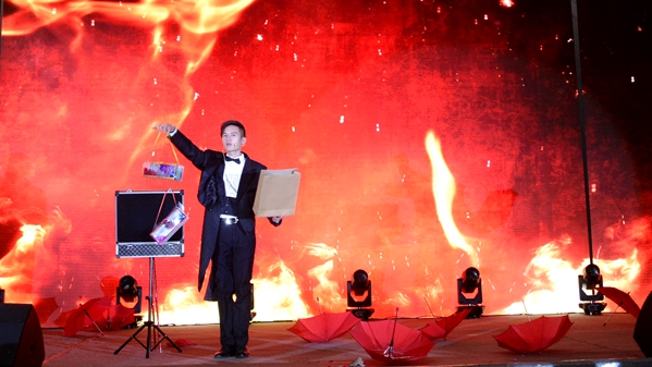 现场气氛热烈、座无虚席,晚会在热情欢快的民乐合奏《龙腾虎跃》中拉开了帷幕。16个节目以歌曲、魔术、舞蹈、小品、朗诵、武术、器乐演奏等形式依次呈现,内容丰富、精彩纷呈。其中,活力健身操《潇洒小姐》动感十足、青春洋溢,展现了商院学子朝气蓬勃、自信向上的精神风貌;小品《青年党员有作为》讲述了大学生党员响应国家号召,主动回归基层,助力乡村振兴的动人故事;歌曲《我们的时光》带我们翻过青山,感受海风拂过椰树的温柔;汉服舞蹈《纸扇书生》以翩若仙鹤的舞步展现出书生的潇洒风姿;朗诵《晨光夕忆》声情并茂,忆往昔革命初心,畅想火红的中国梦;舞蹈《排舞》活力四射,将现场气氛推向高潮。