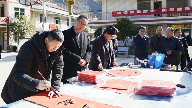 活动期间,我校书法家协会副主席、陕西毛体书法艺术研究院副院长刘全民,艺术学院教师张长林现场展纸挥毫,为群众书写、赠送春联,送去新春祝福。慕名前来的群众络绎不绝,争相收藏自己喜爱的春联,大家笑颜绽放,为和坪村带来了浓浓的年味和文化气息。