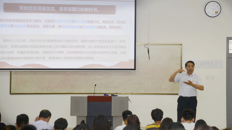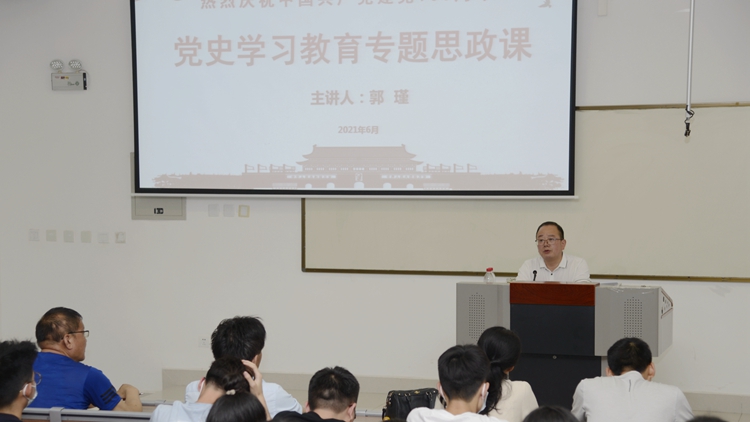 校领导彭虎军、刘勇、王新军、郭瑾在讲授中,带领同学们重温了习近平总书记在党史学习教育动员大会上的重要讲话精神,阐明“学史明理、学史增信、学史崇德、学史力行” 的目标要求,从“深入学习领会习近平总书记关于党史的重要论述、充分认识开展党史学习教育的重大意义;认真研读党史基本著作、全面了解中国共产党百年辉煌;深刻把握党史学习教育的重点;学懂弄通做实习近平新时代中国特色社会主义思想,增强‘四个意识’、坚定‘四个自信’、做到‘两个维护’”等四个方面作了深入浅出的讲解。引导同学们把学党史和悟思想贯通起来,自觉以习近平新时代中国特色社会主义思想特别是习近平总书记关于党史的重要论述为根本遵循,树立正确党史观,准确把握党的历史发展的主题主线、主流本质,理清党史重大事件、重要会议、重要人物,深刻理解“中国共产党为什么能、马克思主义为什么行、中国特色社会主义为什么好”,树立正确的世界观、人生观和价值观,把实现个人价值、奋斗目标、人生理想和国家的前途命运结合起来,坚定理想信念,立大志、明大德、成大才、担大任,努力成为堪当民族复兴重任的时代新人。