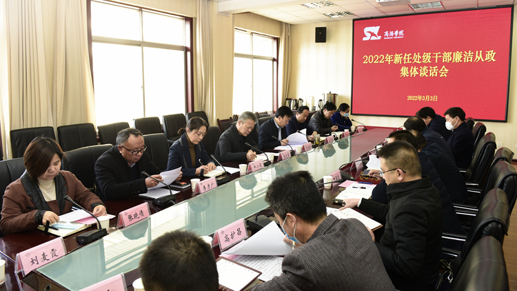 3月3日上午,我校召开2022年新任处级干部廉洁从政集体谈话会。校党委书记张志昌出席会议并讲话,党委副书记彭虎军主持会议。纪委、组织部负责人及21名新任处级干部参加会议。