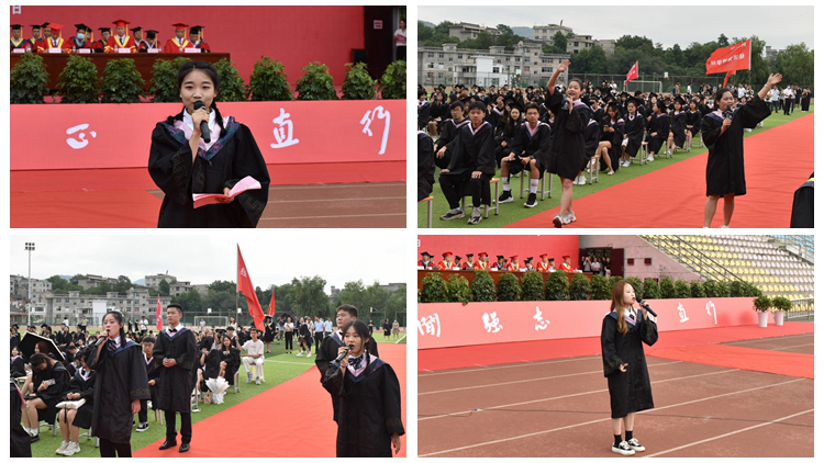 艺术学院张玥、周静等12名毕业生在典礼上演唱了《这世界那么多人》《花儿》《你曾是少年》《把一切献给党》等歌曲,表达了全体毕业生不负韶华、不负青春,不负伟大的时代,牢记使命,为国家建设贡献自己力量,把一切献给党的决心和信心。