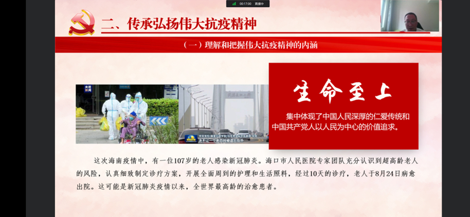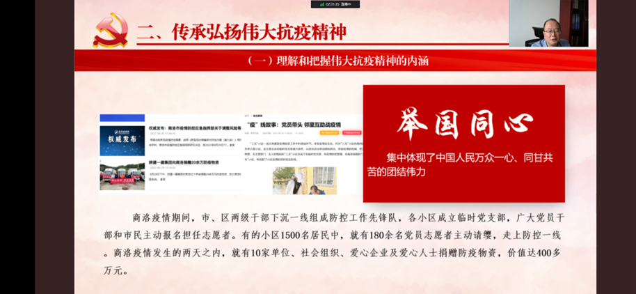 校长范新会在讲授中引用多个鲜活事例,生动形象地阐述了生命至上、举国同心、舍生忘死、尊重科学、命运与共的伟大抗疫精神内涵,系统性总结了中国战“疫”取得的伟大成就。结合近期国内、我省和商州区等疫情防控形势,范新会强调,青年学生要深刻理解和传承弘扬伟大抗疫精神,把握伟大抗疫精神的内涵。一是要肩负使命担当,与祖国和人民同呼吸共命运。青年学生要把学问做在祖国大地上,做接地气的真学问,要到祖国和人民最需要的地方去摸爬滚打,在疫情防控、科技创新、乡村振兴中发光发热,从中找到人生真谛、生命价值和事业方向。二是要厚植爱国情怀,做积极战“疫”的先行者。青年学生要带头遵守疫情防控各项要求,主动传播疫情防控权威信息,分享正能量抗疫故事,解读疫情防控方针政策。要敢于挺身而出,发挥所长、尽己所能为防控工作助力。要服从组织安排,落实安全防护,规范有序参与疫情防控志愿服务,在筑牢校园、社区防疫屏障中,展现88038威尼斯人应有的昂扬斗志和青春力量。
