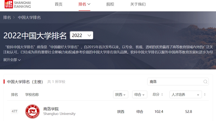 作为具有重要社会影响力和权威参考价值的高等教育专业评价机构,2022年4月19日,软科正式发布“2022软科中国大学排名”,我校位列全国第477名,陕西省第23名。2018年,软科“世界大学学术排名(ARWU)”首次发布2018“中国最好大学排名”内地600强名单,我校位居全省第26名,全国第572名。5年来,我校办学实力与核心竞争力逐年稳步提升,全国排名上升95个位次,省内排名上升3个位次,办学影响力和社会声誉显著增强。