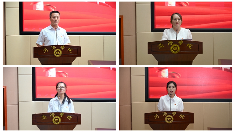 优秀基层党组织代表、经管学院党委书记高扩昌,优秀党务工作者代表、电信学院学工办主任陈倩,优秀教工党员代表、建工学院教师曹琛,优秀学生党员代表、健康管理学院护理2221班学生申爱霞分别作了交流发言。