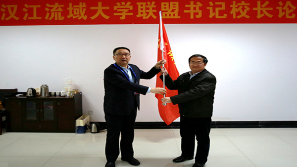 在论坛上,龙治刚向2019年汉江流域联盟轮值理事长单位湖北汽车工业学院授旗,湖北汽车工业学院校长钟毓宁接旗。