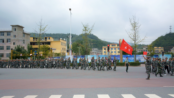 上午8时整,全体参训新生按照10个连编制在学校体育场整齐列队, 随后,在各连旗手的引领下,同学们意气风发,迈着坚定有力的步伐,向目的地进发。走出北新街校区大门后,军训拉练队伍沿街东进,到G40高速引线转而向南,跨过丹江大桥,沿比亚迪大道前行,9点半左右,拉练队伍到达目的地我校丹江校区,原地稍作休息,然后原路返回,拉练总行程约11公里。