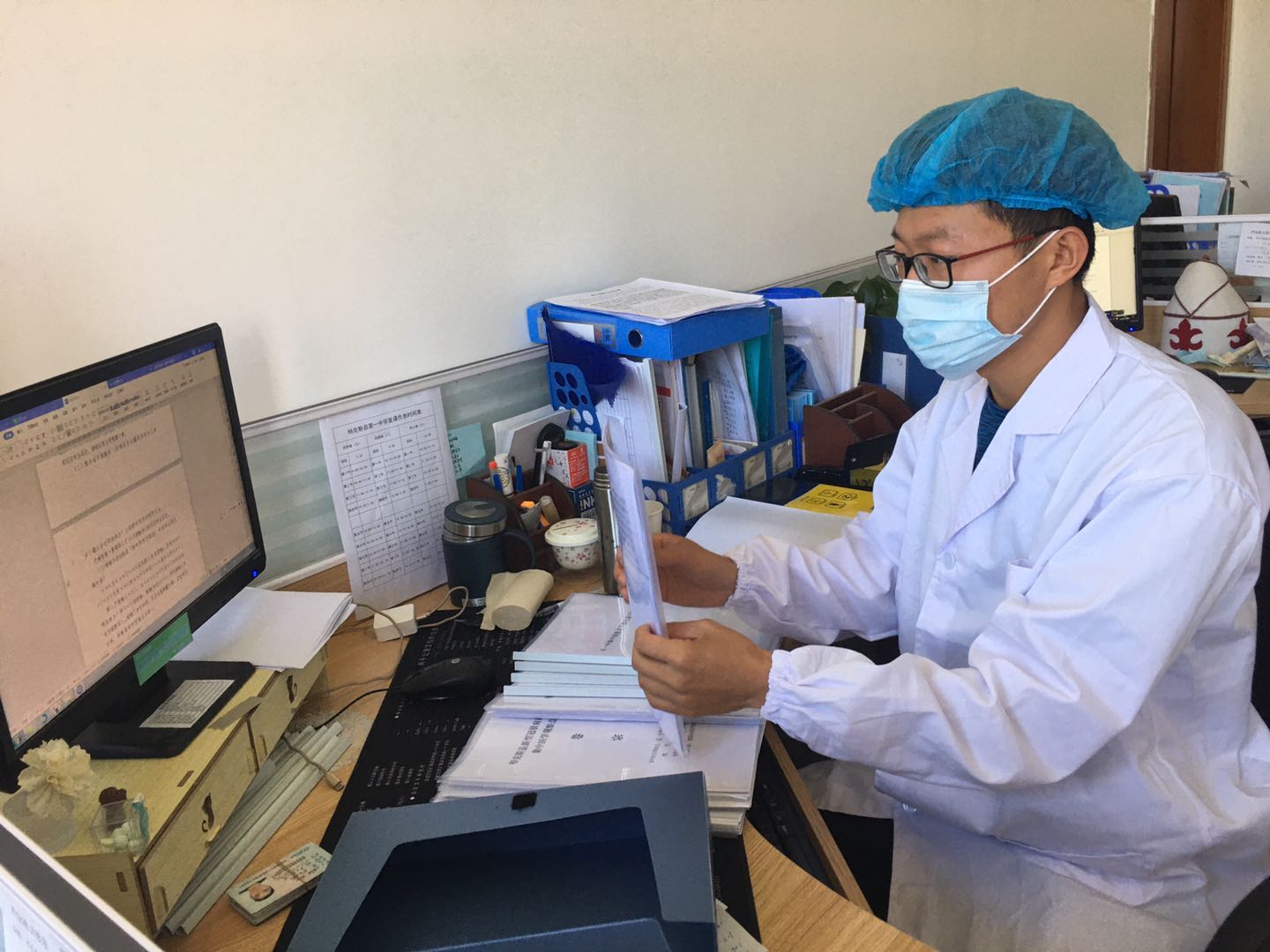 毕业于数学与计算机应用学院统计专业1501班的芦杉,实习结束后就业于伊犁市第九中学,疫情期间坚守防疫岗位,负责为隔离人员送餐、测量体温、消杀房间、健康登记、卫生清洁等工作。毕业于生物医药与食品工程学院生物技术专业的2019届学生吴飞,就业于伊犁州特克斯县第一中学,被抽调到隔离点负责隔离人员档案和心理辅导工作。早起晚睡的他,已连续工作半月有余,每天只能休息3个小时。为了核查清楚隔离人员的流调表,常常需要穿着防护服到隔离人员的房间,逐一询问其旅居史、接触史和活动轨迹。他说“隔离点成立初期,工作量大、任务重,每天基本上都是凌晨5:00睡觉,还要时刻关注隔离人员的心理动态。有些人受疫情影响,情绪波动比较大,有的甚至会做出极端行为,所以每天要和隔离人员通话联系,了解其心理动态,建立台帐。”