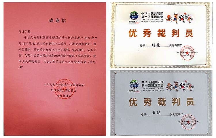 比赛期间,4位教师严格履行裁判员职责,他们严肃认真、公正准确的裁判态度及专业的裁判能力,得到了十四运竞赛委员会的充分肯定和高度赞赏。王健、杨艳获评十四运会优秀裁判员。十四运会田径项目竞赛委员会还向我校发来感谢信,信中对我校的大力支持及王健、杨艳两位教师为十四运会顺利举办所作出的突出贡献表示了衷心的感谢。