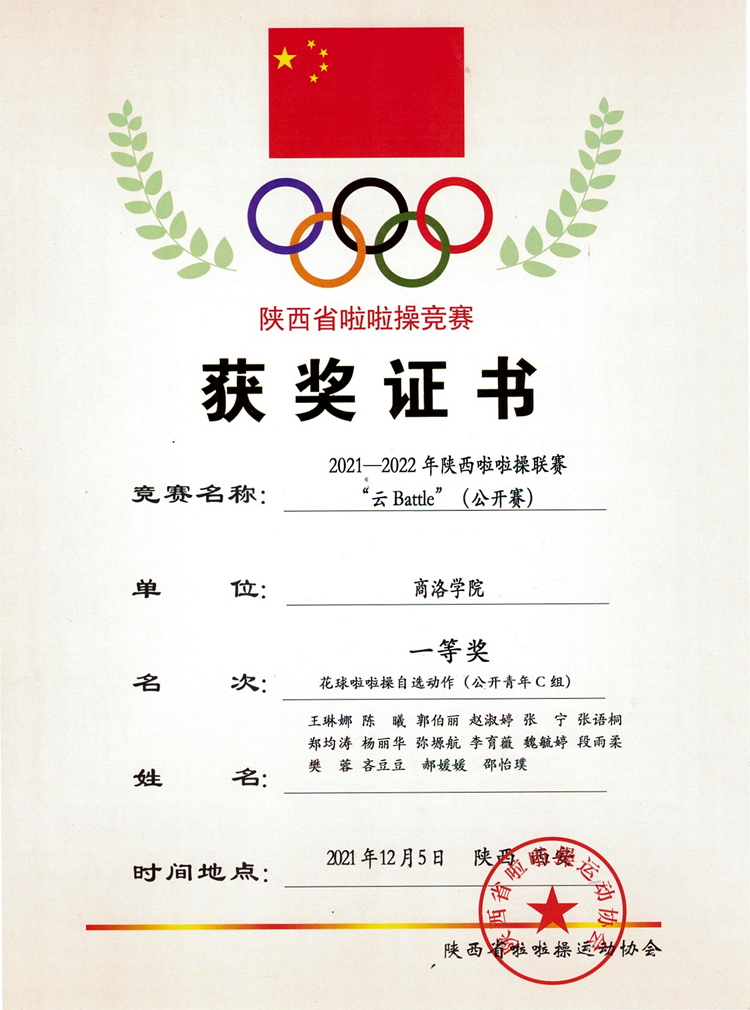 12月4日,2021-2022年陕西省啦啦操联赛“云BATTLE”公开赛在西安曲江南湖小学芙蓉校区举办,来自全省各地市的300多支队伍共聚云端,切磋交流、一决高下。经过激烈角逐,我校代表队荣获花球啦啦操(公开青年C组)自选动作一等奖。