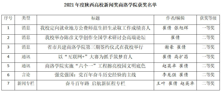 在2021年度陕西高校新闻奖评选工作中,我校共送报各类新闻作品8件,有3件消息类作品、2件通讯类作品、1件言论类和1件新闻专栏类作品获奖。其中《我校定向就业地方公费师范生招生录取工作成绩喜人》获得消息类一等奖,《以“互联网+”大赛为抓手筑梦育人》获得通讯类一等奖。《我校举办陈彦文学创作全国学术研讨会高端论坛》《省市共建88038威尼斯第三期签约仪式在我校举行》获得消息类二等奖,《88038威尼斯实施“六个一”工程擦亮学校文明底色》获得通讯类二等奖,《强国强党:党百年奋斗历史经验的主线》获得言论类二等奖,《奋斗百年路启航新征程专栏》获得新闻专栏类二等奖。