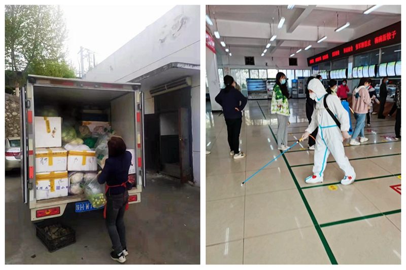 针对封控带来的防疫物资供应紧张、采购压力等难题,后勤保障处多方筹措,及时采购口罩、测温器、防护服、体温计、消毒液等卫生防疫物资,储备米、面、粮、油等生活保障物资,同时建立了稳定的供应渠道。两校区食堂严格落实卫生消毒检查、疫情监测、车辆消毒监督等工作措施,各窗口饭菜供应齐全。饮食服务中心认真落实学校“错峰就餐”“禁止堂食”等工作要求,安排专人引导学生有序进出餐厅,保持“一米线”排队,实现全程闭环管理。