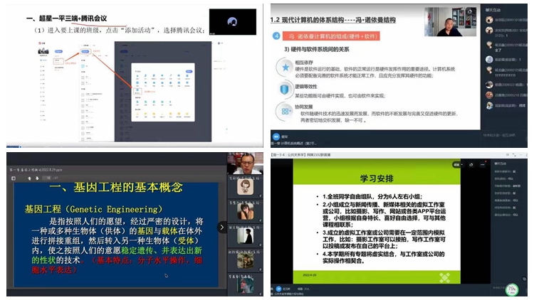8月29日,我校2022-2023学年度第一学期正式开始线上教学。全校师生按照“延期不停教、延期不停学”要求,通过超星学习通、钉钉、雨课堂、微信、QQ群、腾讯会议等在线教学平台开展教学,全校279名主讲教师在线讲授422门次课程,在线上课学生22749人次,线上教学运行整体平稳有序。