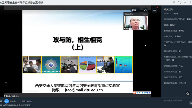 为推动第九届网络安全宣传周活动深入开展,提升师生网络安全意识和防护技能,营造网络安全人人有责、网络安全人人参与的浓厚氛围,9月7日下午,我校通过线上平台举办网络安全知识专家报告会。大会邀请西安交通大学网络空间安全学院副院长、智能网络与网络安全教育部重点实验室副主任陶敬老师作了题为《攻与防,相生相克!》的专题报告。报告会由信息化建设与管理处负责人付军昌主持,各单位网络安全和信息化工作负责人、网络安全和信息化专员,教师代表及2019、2020、2021级全体学生5000余人线上参加报告会。