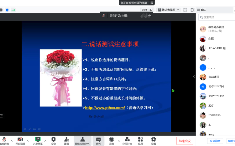 启动仪式上,全体参会人员共同观看了第25届全国推普周公益宣传视频,教务处副处长李会荣介绍了本届“推普周”基本情况。国家级普通话水平测试员、人文学院余琪教授以“‘提升语言文字应用水平,做新时代文明大学生’—普通话学习方法与测试技巧”为题作了专题培训报告,从普通话的概念、推广普通话的重大意义、计算机辅助普通话测试流程、普通话测试四类题型及测评要点、普通话测试训练要领及注意事项、提升普通话水平的方法及学习途径等方面进行了详细讲解,与参会学生进行了线上答疑和互动交流。
