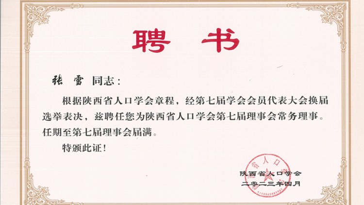 会议选举产生了学会党支部书记和支部委员,审议通过了学会第六届理事会工作报告和财务审计报告,通过了《陕西省人口学会章程(草案)》,选举产生了省人口学会第七届理事会理事、常务理事、副会长、会长、秘书长。张雪当选陕西省人口学会第七届理事会理事及常务理事。