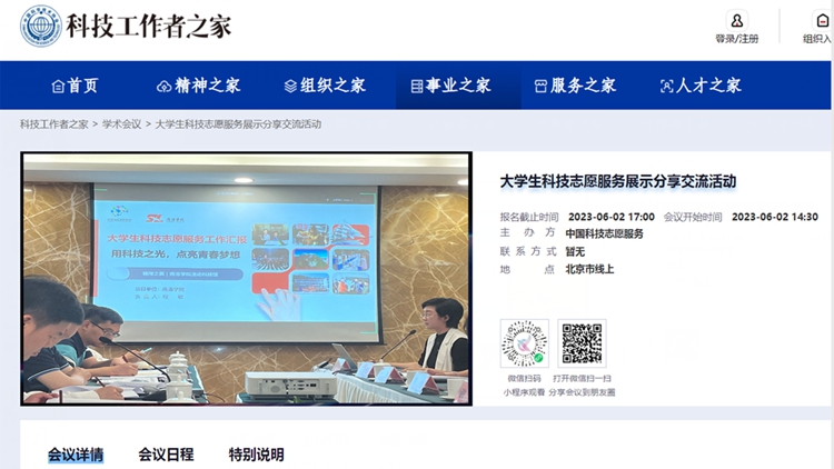 为充分展示大学生科技志愿服务工作典型成效经验,推动相关工作高质量发展,6月2日,由中国科学技术协会主办的全国大学生科技志愿服务交流展示活动在北京举行。中国科学技术协会宣传文化部部长郭哲、北京师范大学民生保障研究中心主任谢琼、全国学校共青团研究中心常务副主任秦涛出席活动并讲话。活动分线下交流、线上展示两个阶段进行,我校与北京航空航天大学、哈尔滨工程大学等6所高校受邀作现场展示交流,800余所高校线上收看直播。