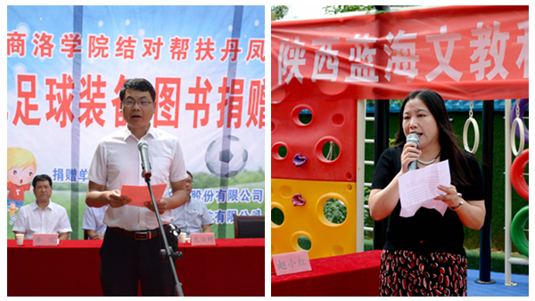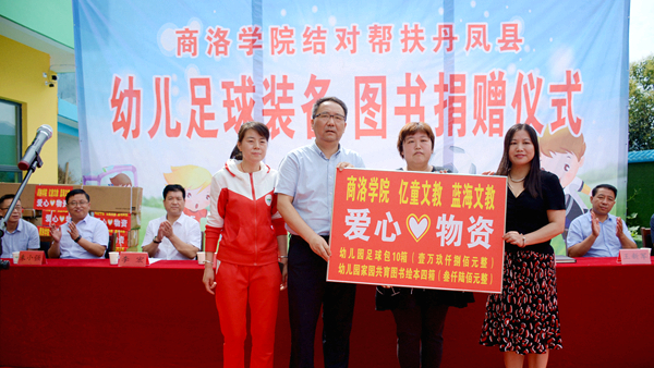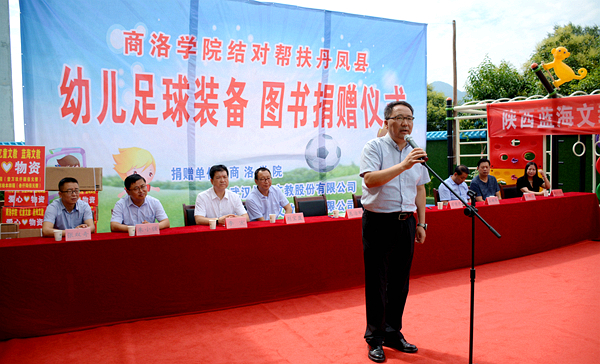 7月9日,我校与武汉亿童文教有限公司、陕西蓝海文教科技有限公司携手为丹凤县棣花镇两岭幼儿园送去爱心足球运动包、爱心图书等价值贰万多元的物资。校双百工程领导小组组长、党委书记龙治刚,副组长、副校长刘宝盈,丹凤县副县长杨思飞,武汉亿童文教有限公司、陕西蓝海文教科技有限公司顾问专家赵小红等领导嘉宾出席捐赠仪式。我校科技处、体育教学研究部及丹凤县少儿足球项目负责人,丹凤县科教体局党政负责人,丹凤县农业局相关负责人等工作人员与两岭幼儿园全体师生家长共同参加了捐赠活动。