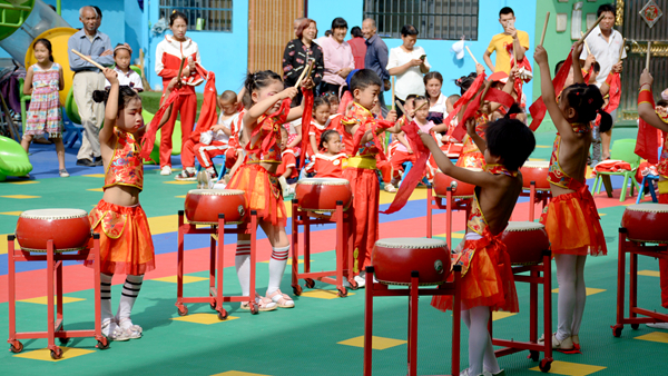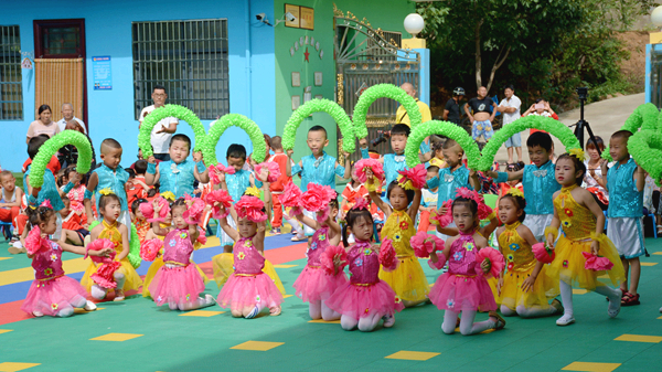 两岭幼儿园园长米娇致答谢词。幼儿园小朋友们现场表演了精彩的锣鼓舞和花环舞,并为嘉宾们送去爱心糖果、手工折纸等以表感谢。
