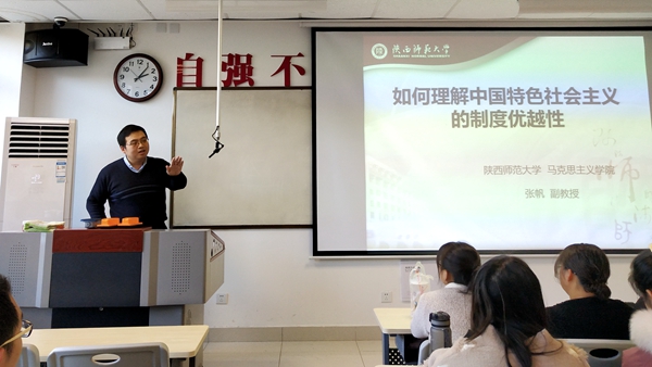为深入学习党的十九届四中全会精神,促进思政课教学改革,提高课堂教学质量。12月4日下午,我校特邀“陕西高校思政课教师大练兵”教学标兵、陕西师范大学副教授张帆来校,以《如何理解中国特色社会主义制度的优越性》为题讲述了一堂公开示范课。我校马克思主义学院班子成员、全体教师及思政1801班学生聆听了示范课。