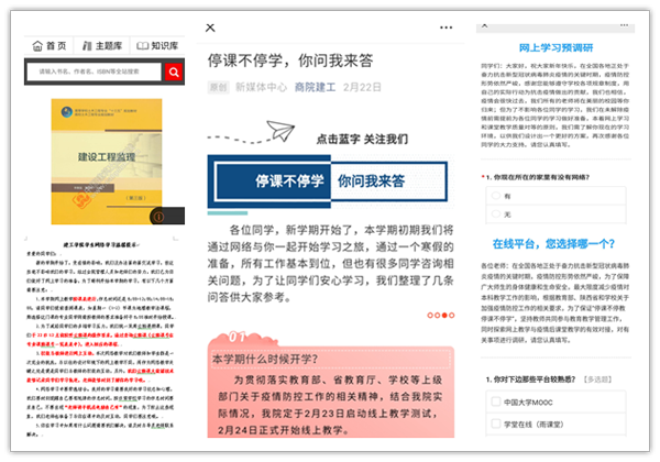 三周以来,建工学院所有课程线上教学顺利进行,广大教师克服各种技术难题精心设计每一节课程,课前叮嘱、课中“连麦”、课后督促,学生主动“响应”、积极配合,师生携手共同成长、快乐学习,成为此次“空中课堂”别样的一道“风景”。土木1921班杜宇航讲到:丰盛的网络教学资源、温馨的课前提示、独特的网络教学模式、流畅的在线互动和无微不至的生活关怀,使我们徜徉在有“温度”的网络学习之中。《土木工程施工技术》教师曹蕾老师讲到:“在传统线下课堂上,一次提问,只能有部分学生作答。在线上课堂里,一次发问,瞬间迎来全体学生的倾情回应,那种隔着屏幕都能感觉到的热情令人泪目,学生主动学习,师生高效互动,我们追求多年的目标,在互联网的云端里变为现实。”