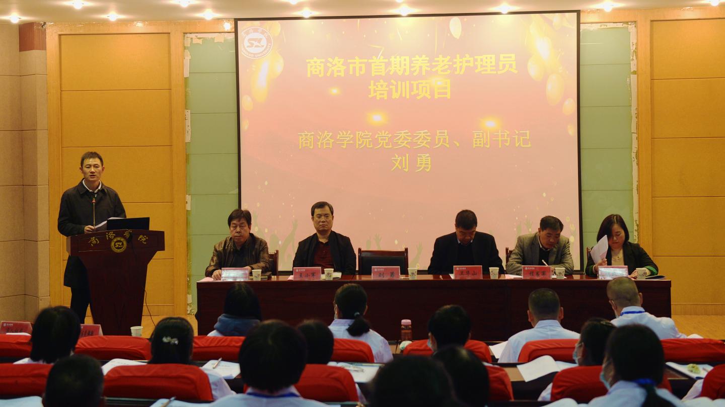 刘勇代表学校对参训学员表示热烈欢迎,对商洛市民政局、商洛市人社局、高新区人社局等部门关心支持养老护理事业发展表示感谢,对多年真诚为老人服务的养老护理员表示敬意。他向与会人员介绍了我校的基本情况和历年来面向社会开展的各类继续教育培训,表示将充分发挥学校作为陕西省养老护理员培训基地的职能,秉承“关爱老人 服务老人”的宗旨,积极助力我市养老护理员培训体系建设和高效高质发展。他希望学员能够端正态度努力学、多动脑筋用心学、挤出时间勤奋学,切实通过培训提高养老护理专业技能。