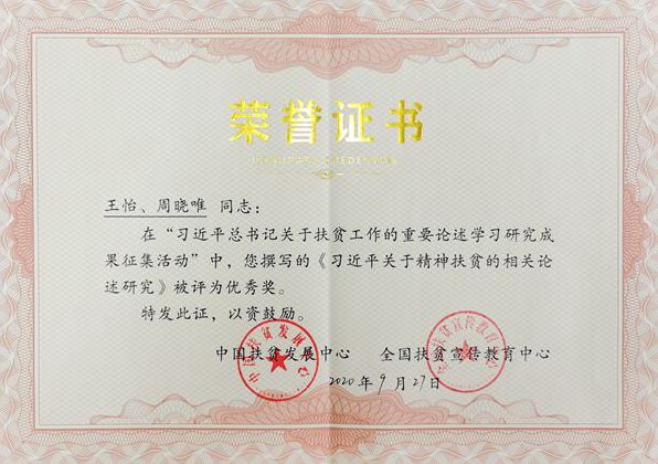 本次评选活动是对国内相关高校、智库及研究机构,学习贯彻落实习近平总书记关于扶贫工作重要论述最新理论和实践成果的一次大检阅,经过初评、复评和终评环节,最终评选出98件获奖作品。《习近平关于精神扶贫的相关论述研究》是国家社科基金项目“连片贫困地区精准扶贫成效评估及‘阻返’长效机制研究”的前期研究成果之一,该成果系统梳理了习近平总书记关于精神扶贫重要论述的形成历程,解读了习近平总书记关于精神扶贫重要论述的理论内涵与主要内容,阐述了习近平总书记关于精神扶贫重要论述的重要实践价值,揭示了习近平总书记关于精神扶贫相关论述的重大历史和时代意义,为进一步深入研究习近平总书记扶贫思想提供了理论参考。