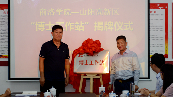 范新会、景小青共同为“博士工作站”揭牌。刘宝盈对我校与山阳高新区建立博士工作站做了详细安排,冀博做总结讲话,崔新成致欢迎词,我校教师陈垚博士做了表态发言。