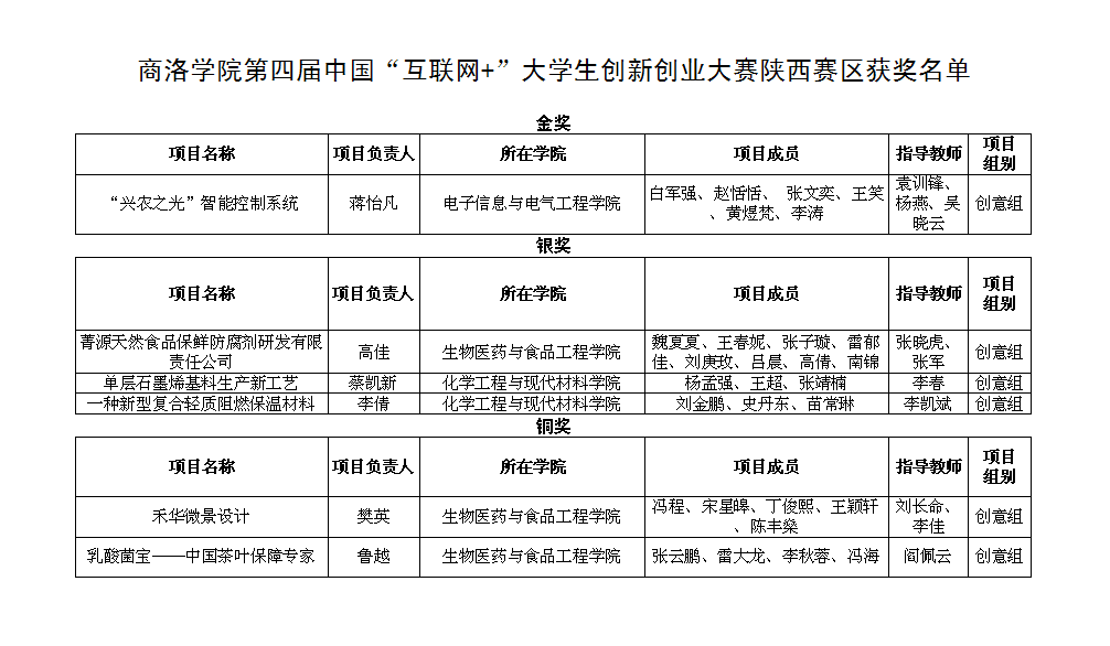 电子信息与电气工程学院蒋怡凡同学负责的《“兴农之光”智能控制系统》项目获得金奖,这是我校首次荣获金奖。生物医药与食品工程学院高佳同学负责的《菁源天然食品保鲜防腐剂研发有限责任公司》项目、化学工程与现代材料学院蔡凯新同学和李倩同学分别负责的《单层石墨烯基料生产新工艺》项目和《一种新型复合轻质阻燃保温材料》项目获得银奖。生物医药与食品工程学院樊英同学和鲁越同学分别负责的《禾华微景设计》项目和《乳酸菌宝——中国茶叶保障专家》项目获得铜奖。