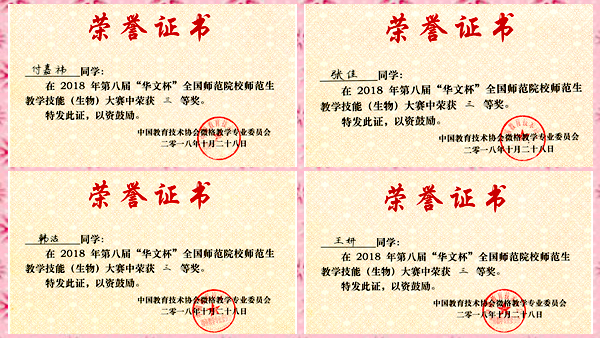 10月27日至28日, 2018年微格教学论坛暨第八届“华文杯”全国师范院校师范生生物教学技能大赛在南京晓庄学院举行。我校生物医药与食品工程学院生物科学专业2015级学生付嘉祎、韩洁、王妍、张佳参加大赛,并分别荣获三等奖。