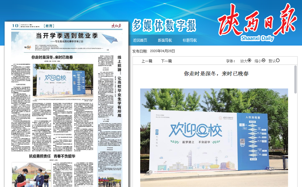 按照省教育厅规定,4月27日各高校可以开始安排毕业年级(含高职和本、硕、博)、医学专业、医学类院校和有科研任务的学生错时错峰返校。近日,陕西日报记者深入省内高校,采访报道了包括我校在内的数所高校,精心做好疫情防控和开学准备工作,在明媚春光中,敞开校门,拥抱归来学子。其中涉及我校内容如下: