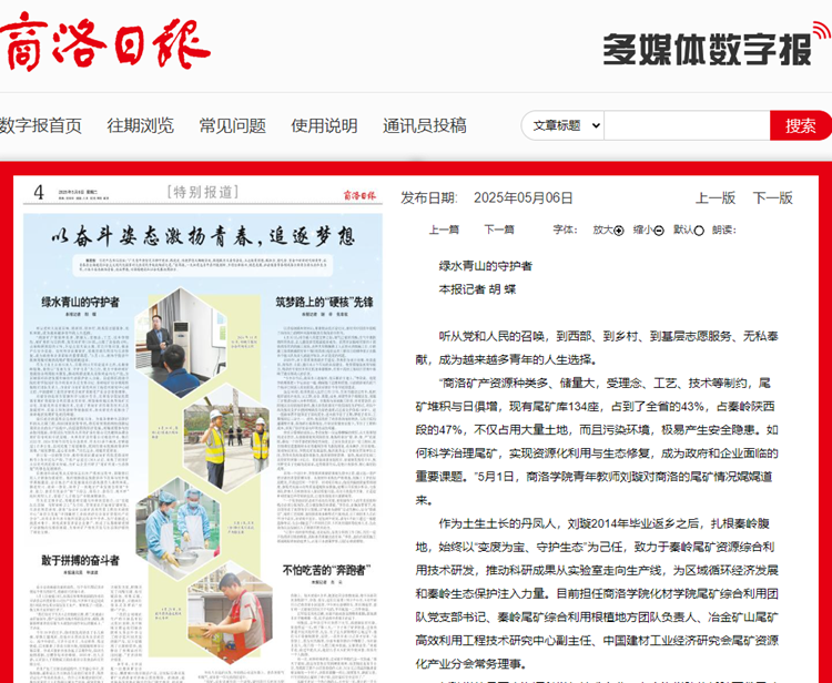 作为党支部书记,刘璇还将党建与科研深度融合,以“党建红生态绿 当好秦岭卫士”为目标,带领团队开展尾矿建材化、生态化利用研究,获批“冶金矿山尾矿高效利用工程技术研究中心”并联合发起“中国建材工业经济研究会尾矿资源化产业分会”,培养出多名省市级科技副总和青年学者,为行业输送大批技术骨干。研究成果在多家企业推广,形成了从基础研究到产业落地的完整创新链,为秦岭矿产绿色开发与生态保护提供了理论支撑。