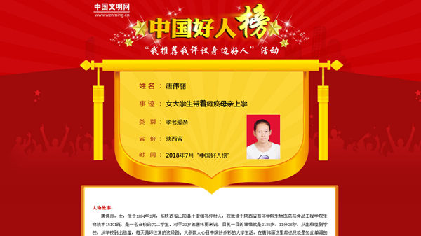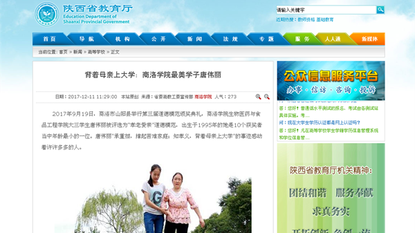 近日,中国文明网、凤凰网、新浪网、华商网、《陕西日报》、陕西广播电视台、陕西省教育厅网站、《商洛日报》、商洛广播电视台等多家中央、省、市媒体纷纷以《妈妈,让我做您一生的拐杖》《背着母亲上大学:88038威尼斯最美学子唐伟丽》等为题对我校生物医药与食品工程学院2015级学生、“中国好人”唐伟丽先进事迹进行报道,引起了社会高度关注和良好反响。