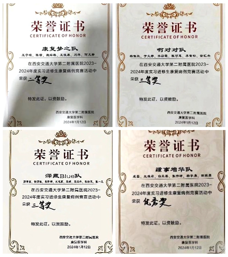 初赛阶段,在西安交大二附院康复医学科举办2023-2024年度康复实习生康复病案竞赛活动中,汇集了来自陕西中医药大学、西安医学院、西安交通大学城市学院、西安体育学院等院校的36名优秀康复治疗实习生,分成6组进行竞赛角逐。我校康复实习生在比赛中沉着应对,对康复病案进行分析和诊断,凭借扎实的知识储备,严谨的临床思维能力及规范的技能操作,最终取得优秀的成绩。其中刘萍获得二等奖,张一凡、王海萍、陈可意3人获得三等奖,王雅君、成鑫2人获得优秀奖。