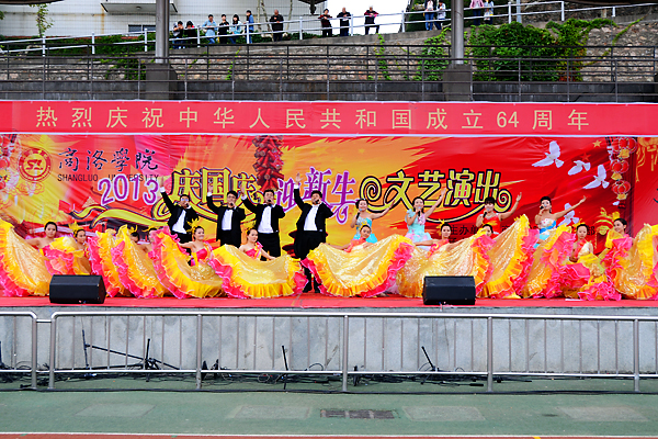 为庆祝新中国第64个生日,迎接2013级新生,9月26日下午,我校举办了“2013庆国庆·迎新生”大型文艺演出。西安音乐学院学院70余名师生应邀友情出演,和我校师生、商洛剧团青年歌手李淼轮番登台献艺,表演了民乐合奏、歌伴舞、独唱、舞蹈、健身秧歌等19个节目。热烈祥和的气氛、清新高雅的艺术为校园带来了节日的欢乐和文化的盛宴