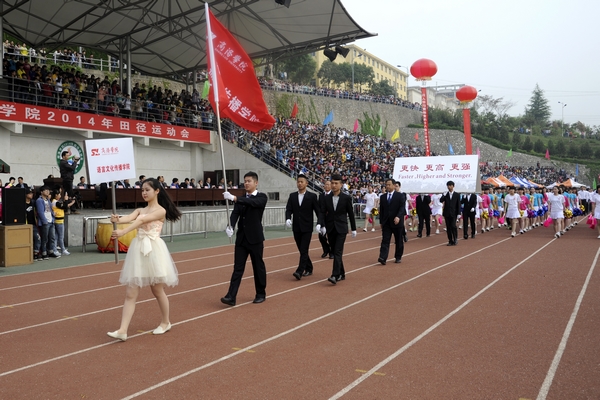 彩旗飘扬,锣鼓铿锵,4月24日上午,我校2014年田径运动会隆重开幕。商洛市政府副市长刘荣贤,校领导张景书、刘建林、左晓民、魏书堂,商洛供电局局长李琦、中国联通商洛分公司总经理古涛、中国电信商洛分公司副总经理胡万社、中国移动商洛分公司副总经理杨林涛出席了开幕式。校内各单位负责人,各学院及教职工组成的10支代表队参加了开幕式。开幕式由副校长魏书堂主持,校党委书记左晓民致开幕词