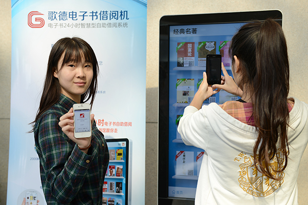 近日,记者看到我校图书馆大厅看到了一部“大手机”,不少读者拿手机在屏幕上翻阅扫描