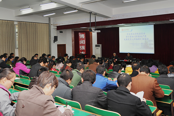11月20日下午,学校召开学习贯彻《中国共产党发展党员工作细则》培训会,对各党总支和直属党支部委员、各党总支下设党支部书记和组织委员100余人进行了专题培训。校党委副书记左晓民出席会议并讲话。培训会由校党委委员、干部人事处处长高荣发主持