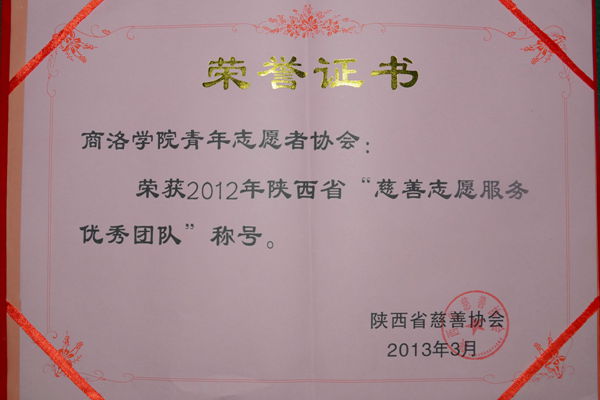 3月3日,陕西省慈善协会下发了《关于表彰2012年慈善志愿服务优秀团队、慈善志愿服务先进个人“一元关爱”先进单位的决定》,我院青年志愿者协会荣获“慈善志愿服务优秀团队”称号。3月12日,商洛市慈善协会下发了《关于表彰2012年度慈善明星企业和慈善工作先进集体的决定》,并授予我院团委“慈善志愿服务活动先进集体”称号。